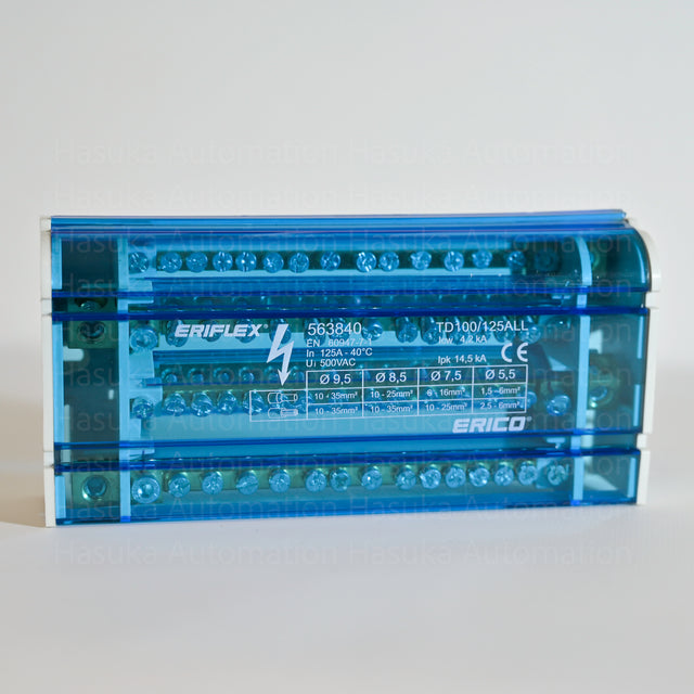 The nVent ERIFLEX TD-100-125ALL is a high-performance 4-pole power distribution block designed for reliable electrical connections. Rated at 125A, it accommodates input cables from 10 to 35mm² and provides 14 outgoing connections per pole, enabling efficient power distribution and streamlined wiring in complex systems.