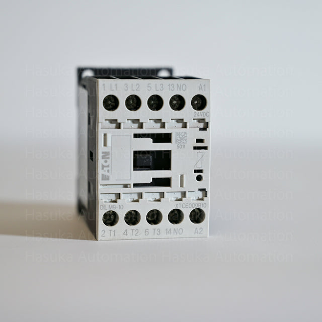 Eaton XTCE009B10 3 pole, 9 AMP AC-3 (20 AMP AC-1) contactor rated 3 H.P. @ 230v, 5 HP @ 460v 3-Phase with 1 normally open (N.O.) base mounted auxiliary contact and an AC or DC rated coil (must choose coil voltage). Each contactor can have a front mounted two or four pole auxiliary contact block added for a total of 5 auxiliary contacts. To form a complete starter, a XTOB overload can be directly mounted to the load side (T1-T2-T3) of the XTCE009B10 for complete Class 10 thermal motor protection.