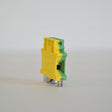 Protective conductor terminal block featuring 2 screw-type connections and 1 position, with a rated cross-section of 16 mm², supporting conductors from 2.5 mm² to 25 mm². When aligned with a same-shaped feed-through terminal block, an end cover must be inserted to ensure insulation voltages above 690 V. Mounted via PE foot with M4 mounting screw, compatible with NS 35/7.5, NS 35/15, and NS 32 DIN rails. Finished in green-yellow for protective conductor identification.