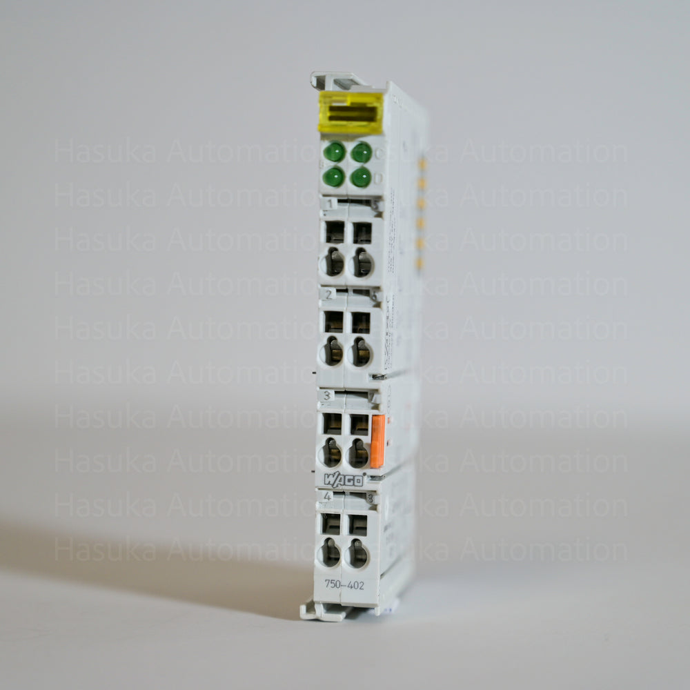 The Wago 750-402 module provides 4 digital inputs for 24 V DC signals with high-side switching. It supports 2-wire and 3-wire sensor connections, features a 3 ms input filter to prevent bounce, and offers reliable performance with 4.5 mA input current per channel. Voltage ranges: _3 to +5 VDC for signal Ô0Õ and 15 to 30 VDC for signal Ô1Õ. Includes 24 V DC sensor supply and operates with a 5 V system supply via data contacts.
