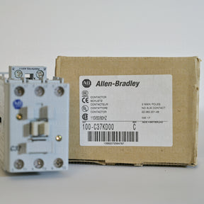 Allen-Bradley 100C37KD00 contactor, discontinued by manufacturer. Designed for AC motor load applications with a 37 A rating and 110 V AC 50,60 Hz coil. Features 3 normally open poles, screw terminals, line side coil termination and single pack configuration.