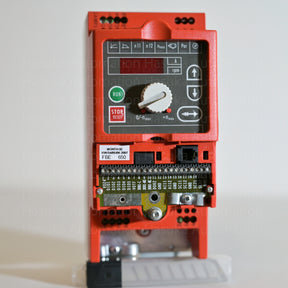 SEW EURODRIVE MC07A004-2B1-4-00 AC drive, discontinued by manufacturer. Part of the MOVITRAC 07 series, this inverter delivers 0.37 kW (0.55 HP) for single-phase systems. Operates on 200–240 VAC supply at 50/60 Hz, with suppression class C1. Features 4Q operation and integrated brake chopper for precise motor control. Lid missing