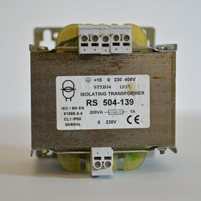 504-139 Output Chassis Mounting Transformer RS PRO, primary voltage rating of 230 V ac to 415V ac and a secondary voltage rating of 230V ac, power rating of 200VA and 1 output