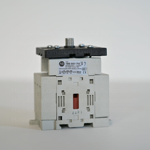 The 194E-E63-1753 Switch by Allen-Bradley is a robust 3-pole device designed for front mounting. It supports a maximum current of 63A and is rated for power up to 18.5kW. With an IP20 enclosure, it offers reliable protection suitable for controlled environments.