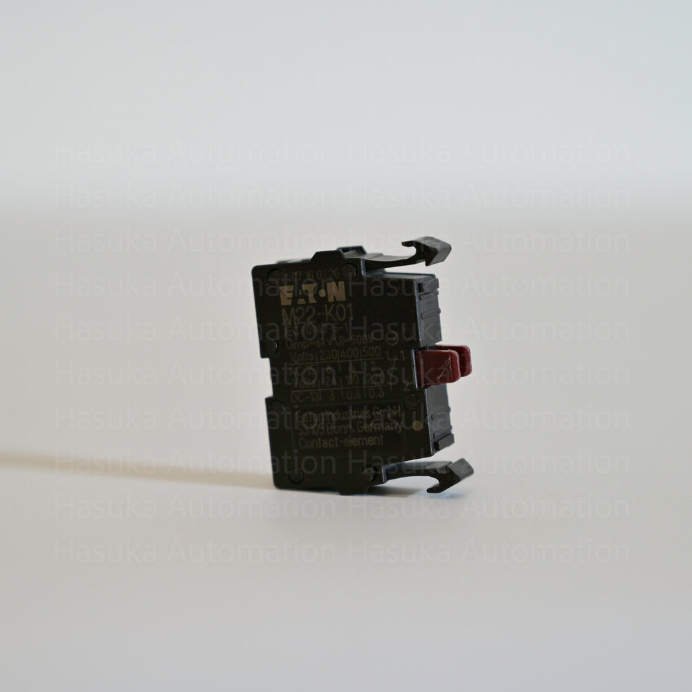 216378 M22-K01 Eaton Moeller® M22 series contact element with front mounting and screw terminals. Features 1 normally closed (NC) break contact, rated for 24 V at 3 A and 220–240 V at 6 A. Designed for reliable operation in control circuit applications.