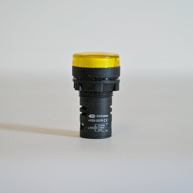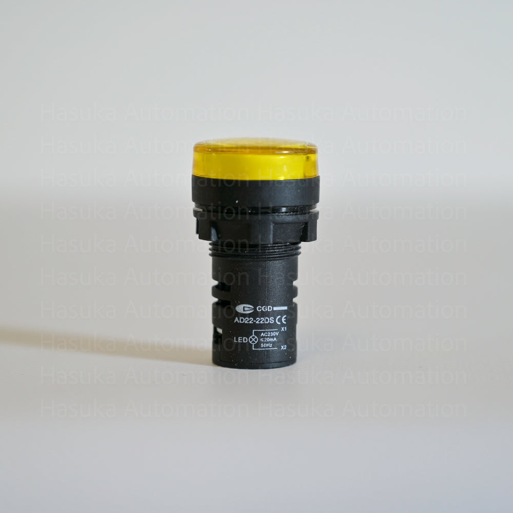 The AD22-22DS LED Light Yellow CGD is a 22mm plastic round pilot lamp unit designed for 230V applications. Featuring a smooth yellow lens and a durable plastic body, it offers an IP66 rating for superior protection against dust and water ingress. The unit includes an energy-efficient LED lamp, ensuring long-lasting visibility. Its screw terminal connection simplifies installation, while compliance with UL, CSA, and CE standards