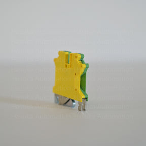 Protective conductor terminal block featuring 2 screw-type connections, rated for a 4 mm² cross-section and suitable for 0.2–6 mm² conductors. When aligned with a feed-through terminal block of the same design, an end cover is required to maintain insulation voltages exceeding 690 V. Mounted via PE foot with M3 mounting screw, compatible with NS 35/7.5, NS 35/15, and NS 32 DIN rails. Available in green-yellow for easy identification.